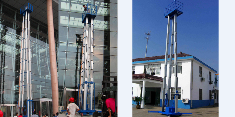 Double mast aluminum lift: a new design of a new generation of products, the overall high strength aluminum refined due to the high intensity profile, minimal deflection and swinging the lifting platform. With double mast column type structure, the capacity is big, the platform area is large, excellent stability, flexible operation, and convenient. The appearance of the light, it can play the highest lifting ability in tiny space. The elevator is widely used in factories, hotels, buildings, shopping malls, railway stations, airports, stadiums, etc. Can be used as a power line, lighting appliances, overhead pipeline installation and maintenance, such as single work the work high above the upper air clean and so on.
